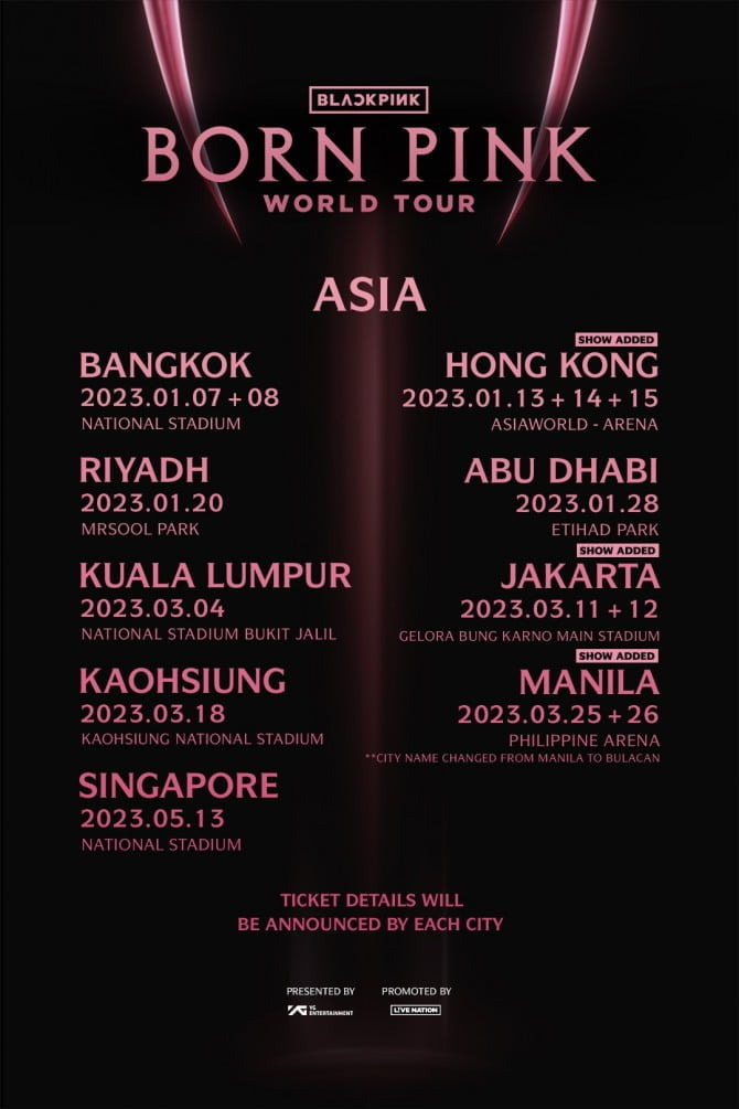 이번 투어는 방콕, 홍콩, 리야드, 아부다비, 쿠알라룸푸르, 카오슝, 싱가포르, 자카르타, 마닐라 등 다양한 도시에서 열릴 예정이에요. 각 도시의 공연 일정은 아래와 같아요: